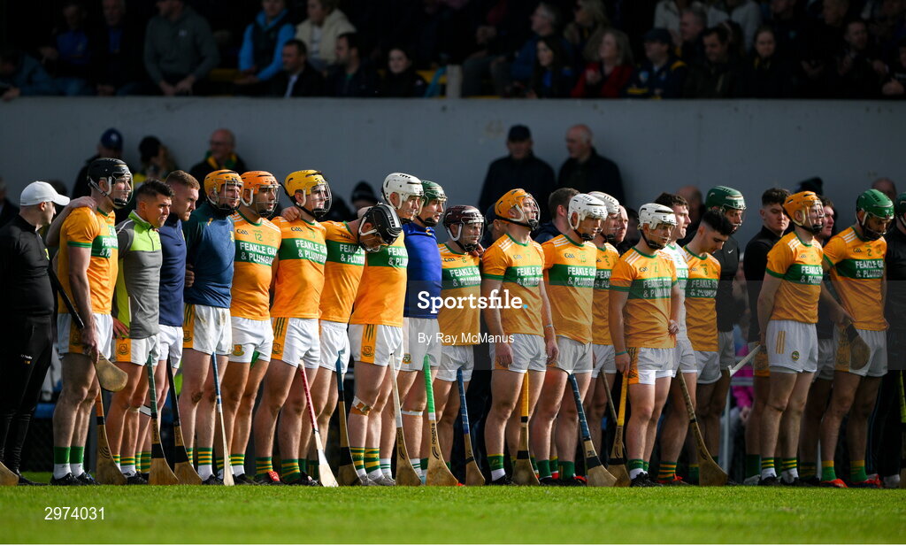 28 October 2024; The Feakle players stand during the Nation Anthem before the Clare County Senior Club Hurling Championship final match between Sixmilebridge and Feakle at Cusack Park in Clare. Photo by Ray McManus/Sportsfile