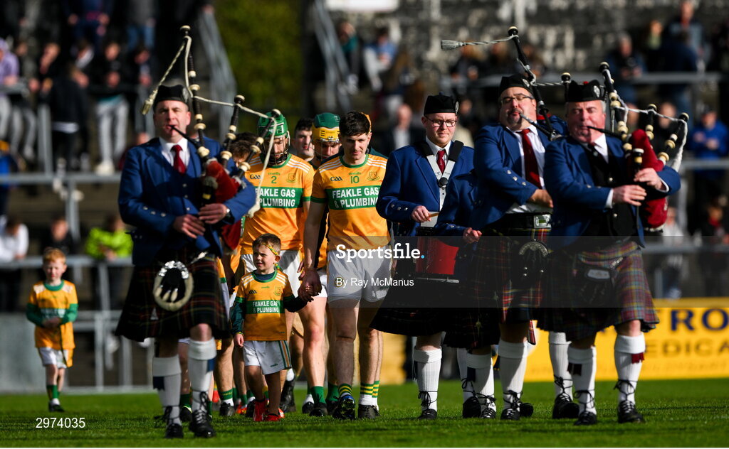 28 October 2024; Feakle captain Oisín Donnellan leads his team during the parade before the Clare County Senior Club Hurling Championship final match between Sixmilebridge and Feakle at Cusack Park in Clare. Photo by Ray McManus/Sportsfile