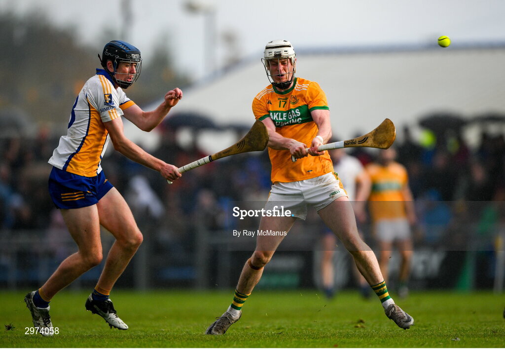 28 October 2024; Steven Conway of Feakle is tackled by Matthew O'Halloran of Sixmilebridge during the Clare County Senior Club Hurling Championship final match between Sixmilebridge and Feakle at Cusack Park in Clare. Photo by Ray McManus/Sportsfile