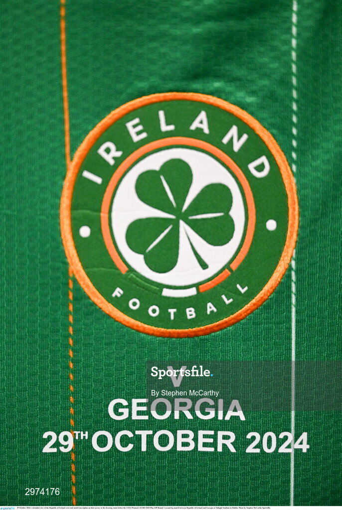 29 October 2024; A detailed view of the Republic of Ireland crest and match inscription on their jersey in the dressing room before the UEFA Women's EURO 2025 Play-Off Round 1 second leg match between Republic of Ireland and Georgia at Tallaght Stadium in Dublin. Photo by Stephen McCarthy/Sportsfile