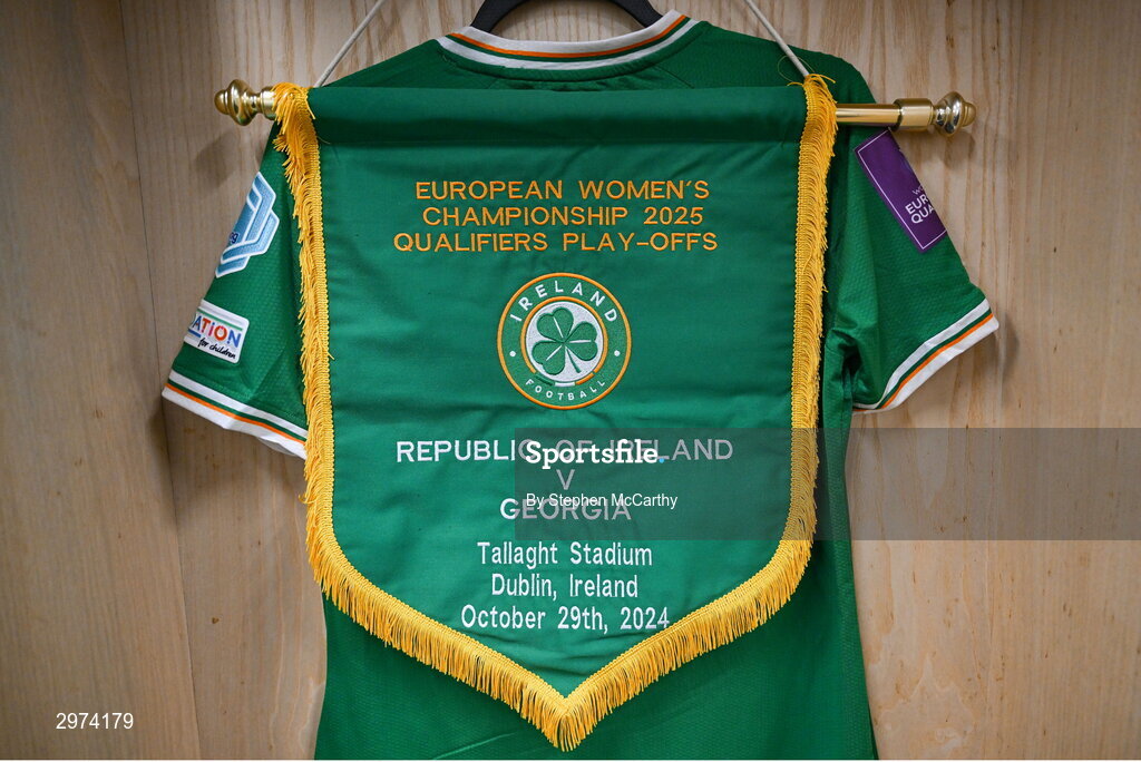 29 October 2024; A general view of the Republic of Ireland match pennant in their dressing room before the UEFA Women's EURO 2025 Play-Off Round 1 second leg match between Republic of Ireland and Georgia at Tallaght Stadium in Dublin. Photo by Stephen McCarthy/Sportsfile