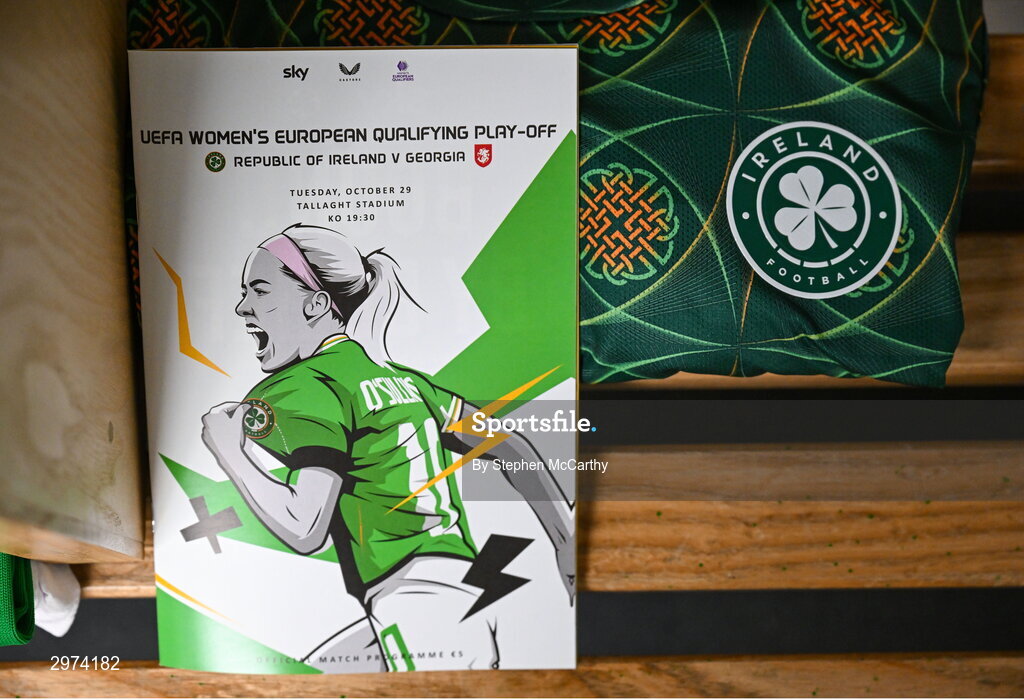 29 October 2024; The match programme in the Republic of Ireland dressing room before the UEFA Women's EURO 2025 Play-Off Round 1 second leg match between Republic of Ireland and Georgia at Tallaght Stadium in Dublin. Photo by Stephen McCarthy/Sportsfile