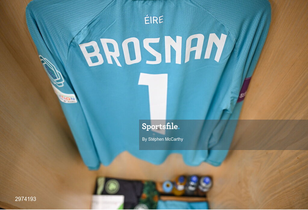 29 October 2024; The jersey of goalkeeper Courtney Brosnan hangs in the Republic of Ireland dressing room before the UEFA Women's EURO 2025 Play-Off Round 1 second leg match between Republic of Ireland and Georgia at Tallaght Stadium in Dublin. Photo by Stephen McCarthy/Sportsfile