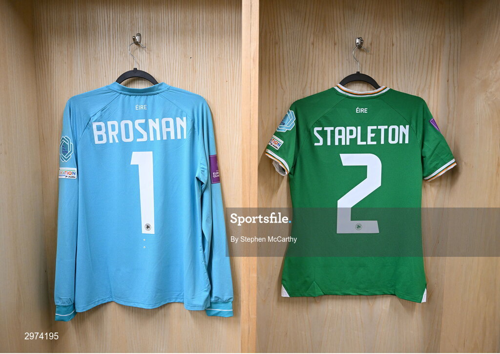29 October 2024; The jersey's of Courtney Brosnan and Jessie Stapleton hang in the Republic of Ireland dressing room before the UEFA Women's EURO 2025 Play-Off Round 1 second leg match between Republic of Ireland and Georgia at Tallaght Stadium in Dublin. Photo by Stephen McCarthy/Sportsfile