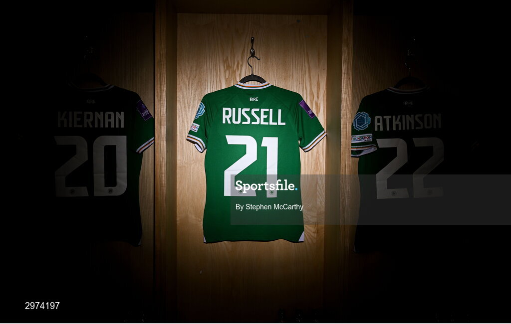 29 October 2024; The jersey of Julie-Ann Russell hangs in the Republic of Ireland dressing room before the UEFA Women's EURO 2025 Play-Off Round 1 second leg match between Republic of Ireland and Georgia at Tallaght Stadium in Dublin. Photo by Stephen McCarthy/Sportsfile