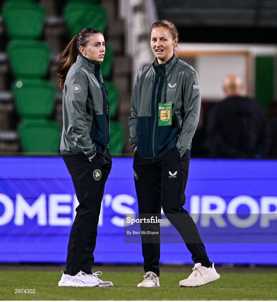 29 October 2024; Abbie Larkin, left, and Kyra Carusa of Republic of Ireland walk the pitch before the UEFA Women's EURO 2025 Play-Off Round 1 second leg match between Republic of Ireland and Georgia at Tallaght Stadium in Dublin. Photo by Ben McShane/Sportsfile