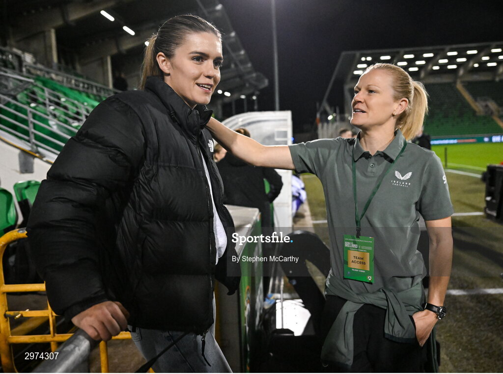 29 October 2024; Injured Republic of Ireland player Jamie Finn, left, meets teammate Diane Caldwell before the UEFA Women's EURO 2025 Play-Off Round 1 second leg match between Republic of Ireland and Georgia at Tallaght Stadium in Dublin. Photo by Stephen McCarthy/Sportsfile