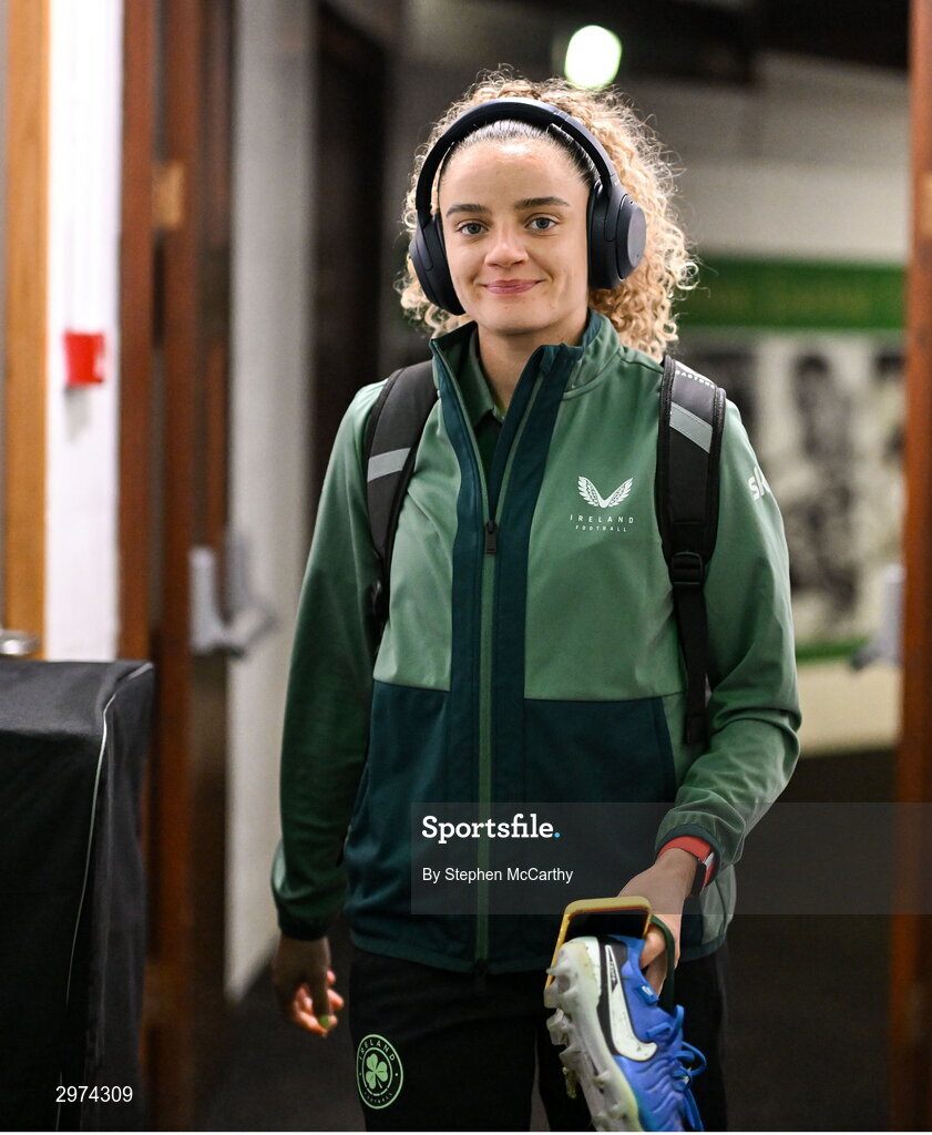 29 October 2024; Leanne Kiernan of Republic of Ireland arrives before the UEFA Women's EURO 2025 Play-Off Round 1 second leg match between Republic of Ireland and Georgia at Tallaght Stadium in Dublin. Photo by Stephen McCarthy/Sportsfile