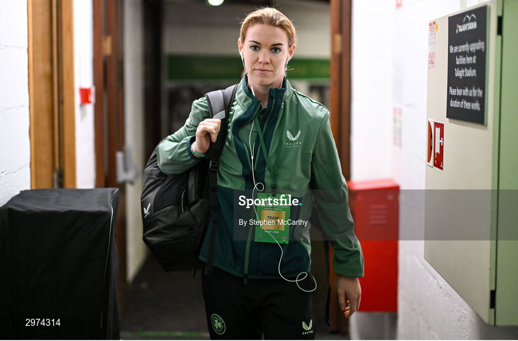 29 October 2024; Aoife Mannion of Republic of Ireland arrives before the UEFA Women's EURO 2025 Play-Off Round 1 second leg match between Republic of Ireland and Georgia at Tallaght Stadium in Dublin. Photo by Stephen McCarthy/Sportsfile