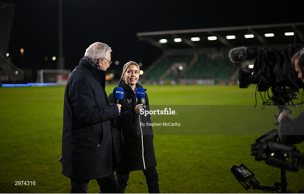 29 October 2024; Denise O'Sullivan of Republic of Ireland is interviewed by Tony O'Donoghue of RTE before the UEFA Women's EURO 2025 Play-Off Round 1 second leg match between Republic of Ireland and Georgia at Tallaght Stadium in Dublin. Photo by Stephen McCarthy/Sportsfile