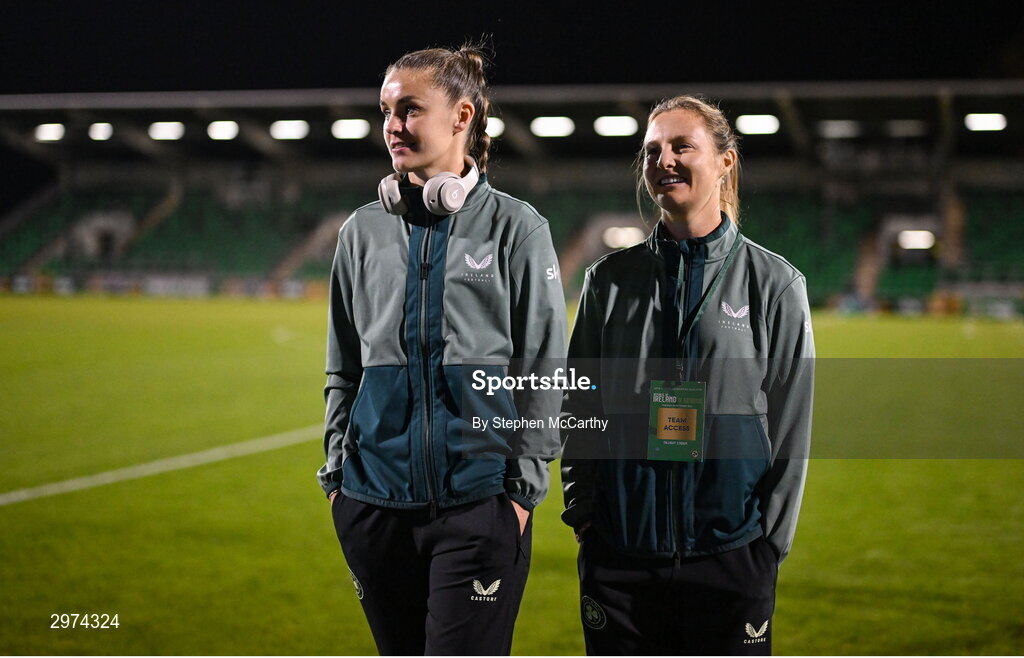 29 October 2024; Caitlin Hayes, left, and Kyra Carusa of Republic of Ireland walk the pitch before the UEFA Women's EURO 2025 Play-Off Round 1 second leg match between Republic of Ireland and Georgia at Tallaght Stadium in Dublin. Photo by Stephen McCarthy/Sportsfile