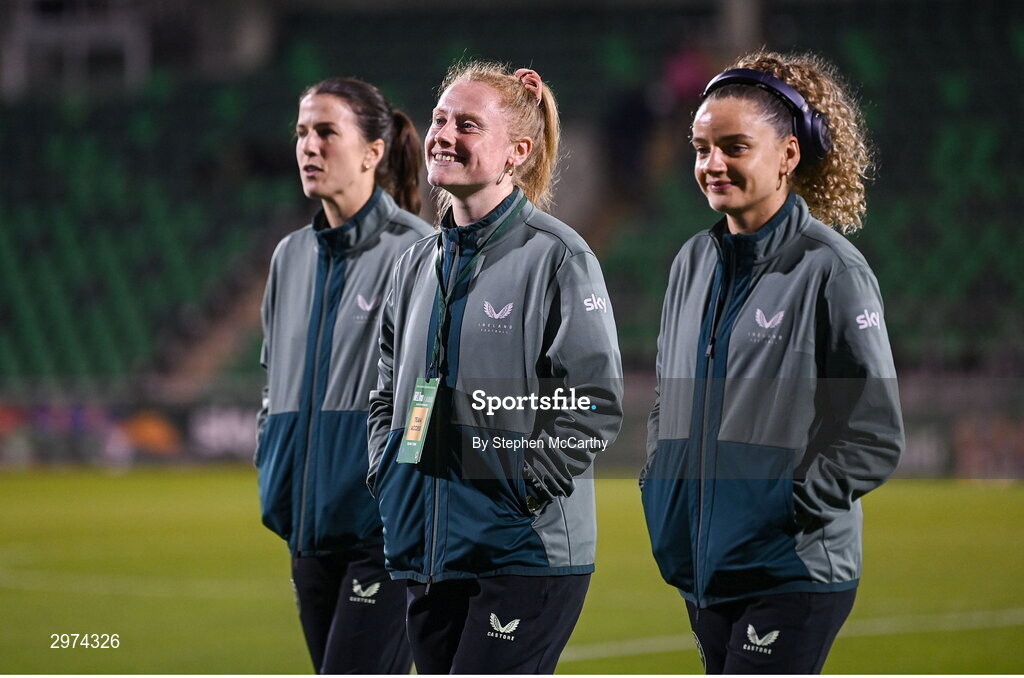 29 October 2024; Republic of Ireland players, from left, Niamh Fahey, Amber Barrett and Leanne Kiernan walk the pitch before the UEFA Women's EURO 2025 Play-Off Round 1 second leg match between Republic of Ireland and Georgia at Tallaght Stadium in Dublin. Photo by Stephen McCarthy/Sportsfile