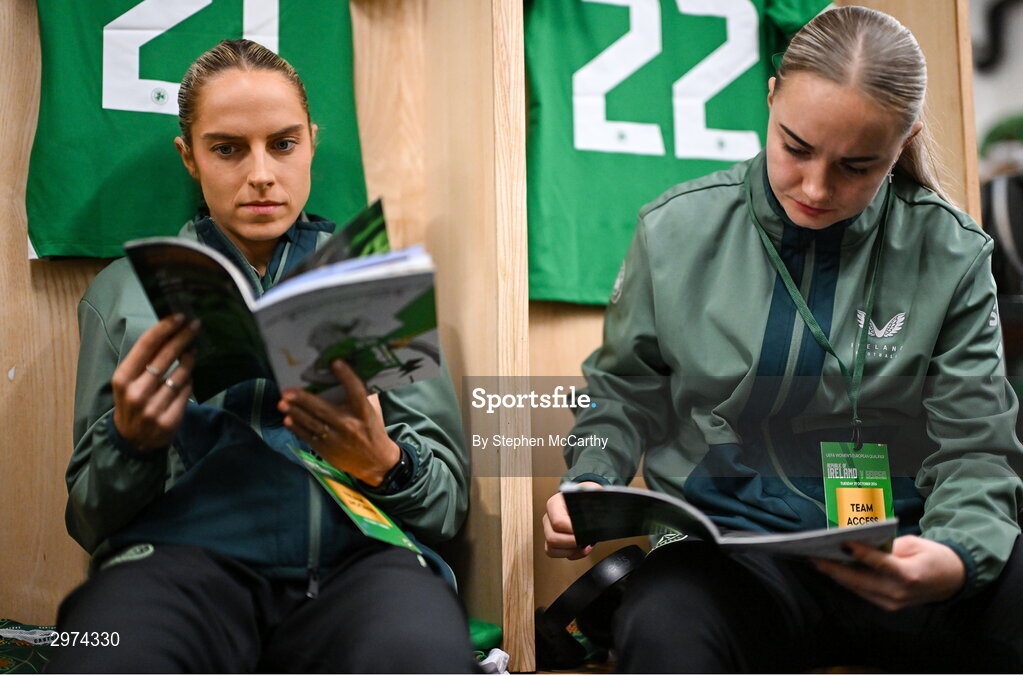 29 October 2024; Julie-Ann Russell, left, and Izzy Atkinson of Republic of Ireland in the dressingroom before the UEFA Women's EURO 2025 Play-Off Round 1 second leg match between Republic of Ireland and Georgia at Tallaght Stadium in Dublin. Photo by Stephen McCarthy/Sportsfile