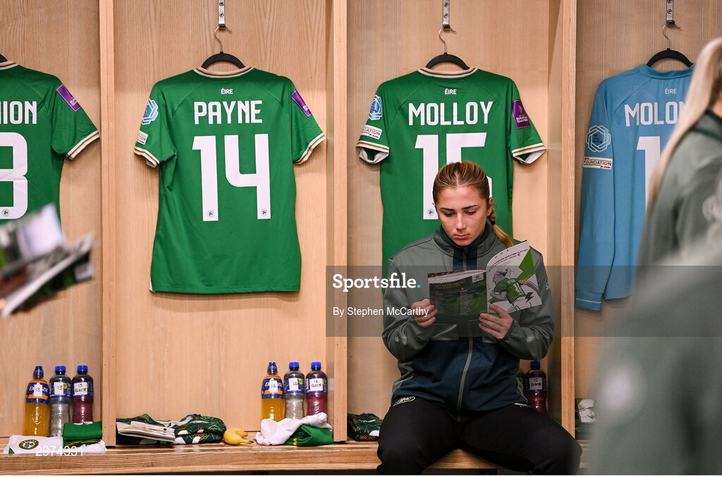 29 October 2024; Ellen Molloy of Republic of Ireland in the dressingroom before the UEFA Women's EURO 2025 Play-Off Round 1 second leg match between Republic of Ireland and Georgia at Tallaght Stadium in Dublin. Photo by Stephen McCarthy/Sportsfile