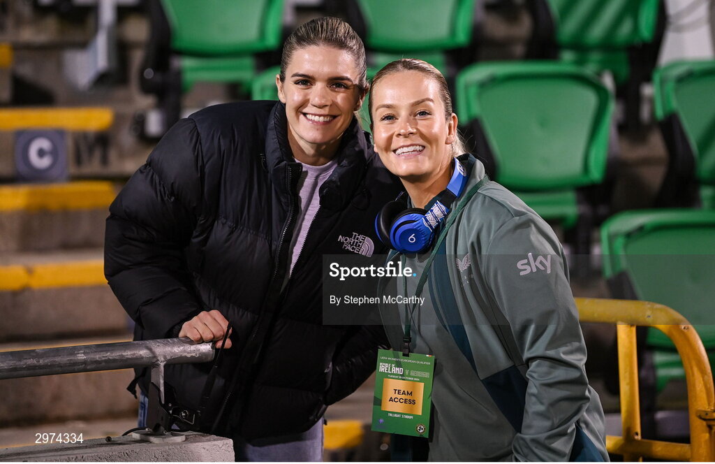 29 October 2024; Injured Republic of Ireland player Jamie Finn, left, and Lily Agg of Republic of Ireland before the UEFA Women's EURO 2025 Play-Off Round 1 second leg match between Republic of Ireland and Georgia at Tallaght Stadium in Dublin. Photo by Stephen McCarthy/Sportsfile