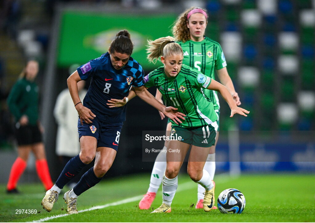 29 October 2024; Danielle Maxwell of Northern Ireland in action against Maja Jošcak of Croatia during the UEFA Women's EURO 2025 Play-Off Round 1 Second Leg match between Northern Ireland and Croatia at the National Football Stadium in Windsor Park, Belfast. Photo by Ramsey Cardy/Sportsfile