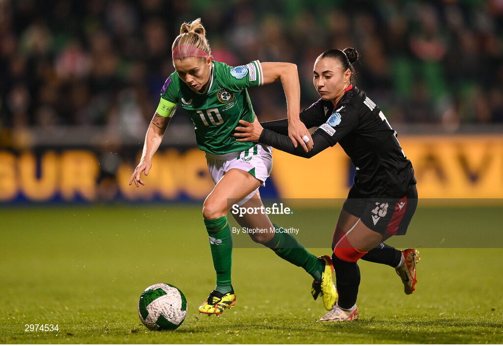 29 October 2024; Denise O'Sullivan of Republic of Ireland in action against Salomi Dimopoulou of Georgia during the UEFA Women's EURO 2025 Play-Off Round 1 second leg match between Republic of Ireland and Georgia at Tallaght Stadium in Dublin. Photo by Stephen McCarthy/Sportsfile