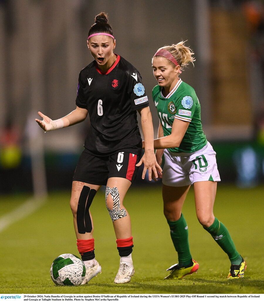 29 October 2024; Natia Danelia of Georgia in action against Denise O'Sullivan of Republic of Ireland during the UEFA Women's EURO 2025 Play-Off Round 1 second leg match between Republic of Ireland and Georgia at Tallaght Stadium in Dublin. Photo by Stephen McCarthy/Sportsfile