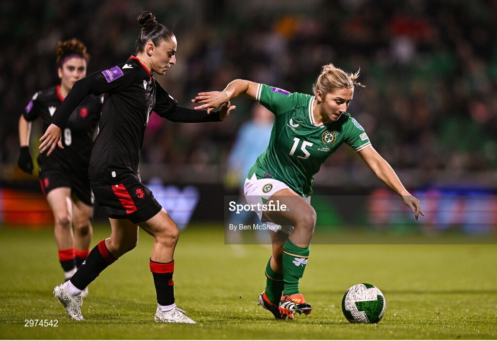 29 October 2024; Ellen Molloy of Republic of Ireland in action against Salome Gasviani of Georgia during the UEFA Women's EURO 2025 Play-Off Round 1 second leg match between Republic of Ireland and Georgia at Tallaght Stadium in Dublin. Photo by Ben McShane/Sportsfile
