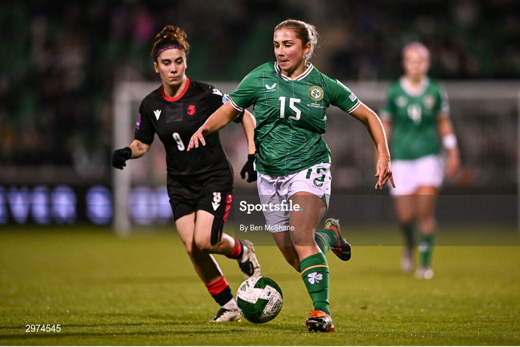 29 October 2024; Ellen Molloy of Republic of Ireland in action against Maiko Bebia of Georgia during the UEFA Women's EURO 2025 Play-Off Round 1 second leg match between Republic of Ireland and Georgia at Tallaght Stadium in Dublin. Photo by Ben McShane/Sportsfile