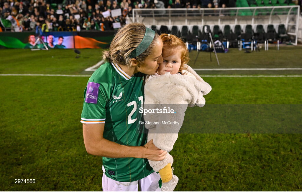 29 October 2024; Julie-Ann Russell of Republic of Ireland celebrates with her daughter Rosie after the UEFA Women's EURO 2025 Play-Off Round 1 second leg match between Republic of Ireland and Georgia at Tallaght Stadium in Dublin. Photo by Stephen McCarthy/Sportsfile