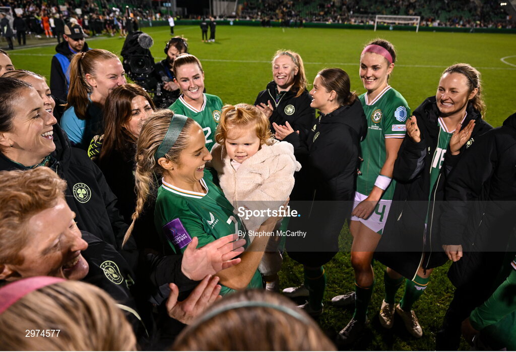 29 October 2024; Julie-Ann Russell of Republic of Ireland celebrates with her daughter Rosie and teammates after the UEFA Women's EURO 2025 Play-Off Round 1 second leg match between Republic of Ireland and Georgia at Tallaght Stadium in Dublin. Photo by Stephen McCarthy/Sportsfile
