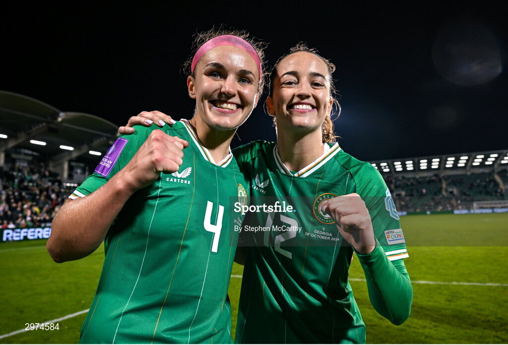 29 October 2024; Caitlin Hayes, left, and Anna Patten of Republic of Ireland celebrate after the UEFA Women's EURO 2025 Play-Off Round 1 second leg match between Republic of Ireland and Georgia at Tallaght Stadium in Dublin. Photo by Stephen McCarthy/Sportsfile