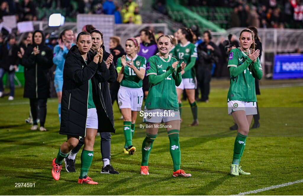 29 October 2024; Republic of Ireland players, from left, Katie McCabe, Izzy Atkinson and Heather Payne after the UEFA Women's EURO 2025 Play-Off Round 1 second leg match between Republic of Ireland and Georgia at Tallaght Stadium in Dublin. Photo by Ben McShane/Sportsfile