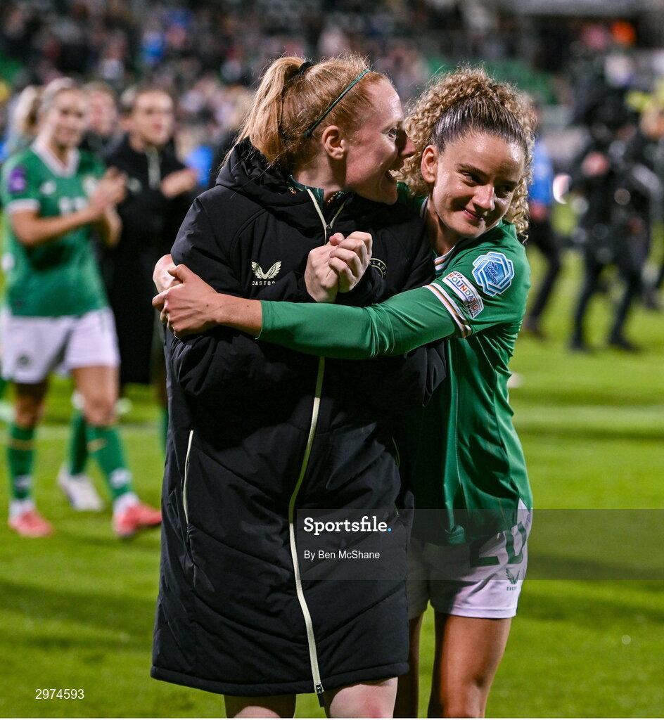 29 October 2024; Amber Barrett, left, and Leanne Kiernan of Republic of Ireland after the UEFA Women's EURO 2025 Play-Off Round 1 second leg match between Republic of Ireland and Georgia at Tallaght Stadium in Dublin. Photo by Ben McShane/Sportsfile