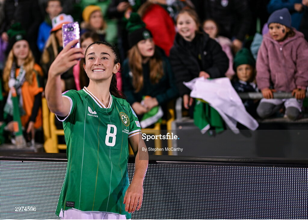 29 October 2024; Marissa Sheva of Republic of Ireland takes a selfie with supporters after the UEFA Women's EURO 2025 Play-Off Round 1 second leg match between Republic of Ireland and Georgia at Tallaght Stadium in Dublin. Photo by Stephen McCarthy/Sportsfile