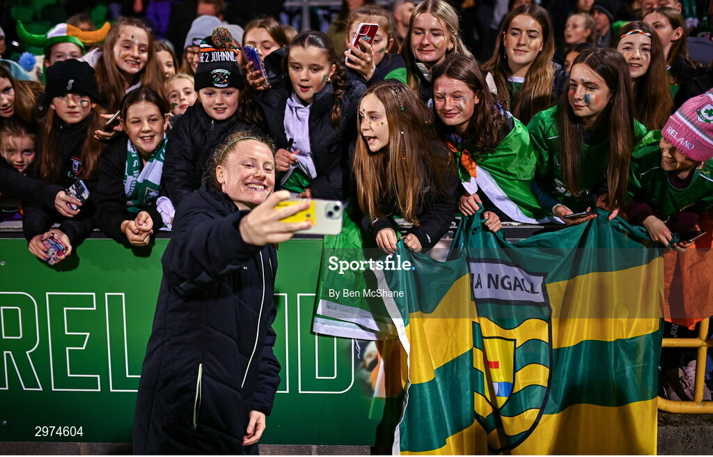 29 October 2024; Amber Barrett of Republic of Ireland takes selfie with supporters after the UEFA Women's EURO 2025 Play-Off Round 1 second leg match between Republic of Ireland and Georgia at Tallaght Stadium in Dublin. Photo by Ben McShane/Sportsfile