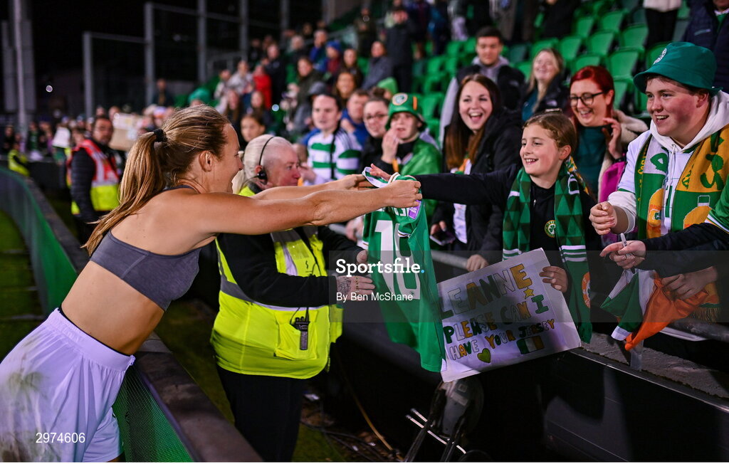 29 October 2024; Kyra Carusa of Republic of Ireland gives her jersey to a supporter after the UEFA Women's EURO 2025 Play-Off Round 1 second leg match between Republic of Ireland and Georgia at Tallaght Stadium in Dublin. Photo by Ben McShane/Sportsfile