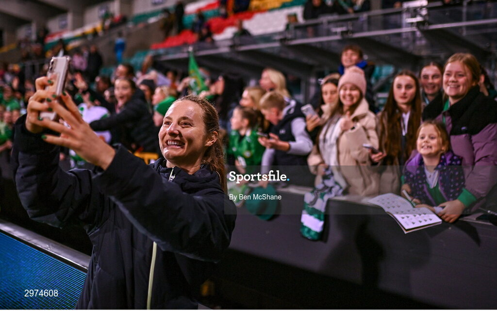 29 October 2024; Kyra Carusa of Republic of Ireland takes a selfie with supporters after the UEFA Women's EURO 2025 Play-Off Round 1 second leg match between Republic of Ireland and Georgia at Tallaght Stadium in Dublin. Photo by Ben McShane/Sportsfile