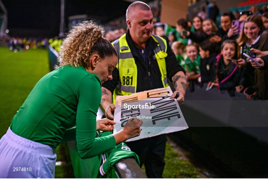 29 October 2024; Leanne Kiernan of Republic of Ireland signs autographs after the UEFA Women's EURO 2025 Play-Off Round 1 second leg match between Republic of Ireland and Georgia at Tallaght Stadium in Dublin. Photo by Ben McShane/Sportsfile