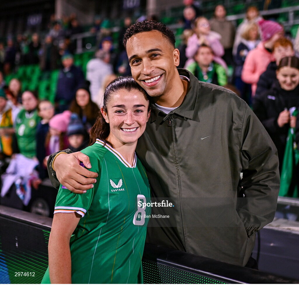 29 October 2024; Marissa Sheva of Republic of Ireland with her partner Zach after the UEFA Women's EURO 2025 Play-Off Round 1 second leg match between Republic of Ireland and Georgia at Tallaght Stadium in Dublin. Photo by Ben McShane/Sportsfile