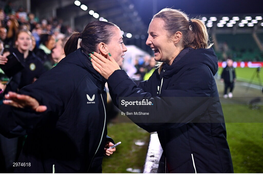 29 October 2024; Abbie Larkin, left, and Kyra Carusa of Republic of Ireland after the UEFA Women's EURO 2025 Play-Off Round 1 second leg match between Republic of Ireland and Georgia at Tallaght Stadium in Dublin. Photo by Ben McShane/Sportsfile
