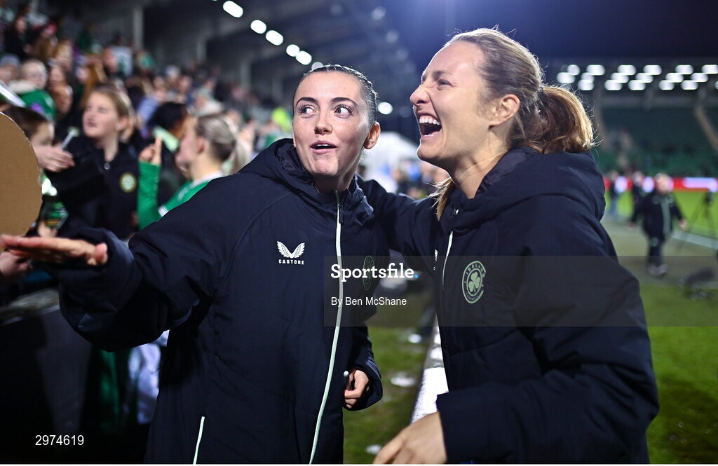 29 October 2024; Abbie Larkin, left, and Kyra Carusa of Republic of Ireland after the UEFA Women's EURO 2025 Play-Off Round 1 second leg match between Republic of Ireland and Georgia at Tallaght Stadium in Dublin. Photo by Ben McShane/Sportsfile