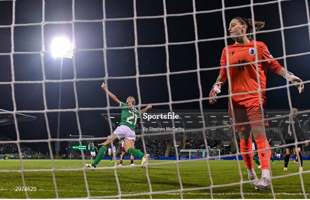 29 October 2024; Julie-Ann Russell of Republic of Ireland celebrates after scoring her side's first goal during the UEFA Women's EURO 2025 Play-Off Round 1 second leg match between Republic of Ireland and Georgia at Tallaght Stadium in Dublin. Photo by Stephen McCarthy/Sportsfile