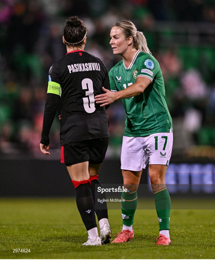 29 October 2024; Lily Agg of Republic of Ireland, right, and Nino Pasikashvili of Georgia after the UEFA Women's EURO 2025 Play-Off Round 1 second leg match between Republic of Ireland and Georgia at Tallaght Stadium in Dublin. Photo by Ben McShane/Sportsfile