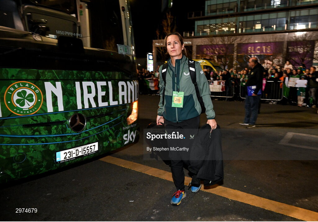 29 October 2024; Republic of Ireland performance psychologist Sarah Murray arrives for the UEFA Women's EURO 2025 Play-Off Round 1 second leg match between Republic of Ireland and Georgia at Tallaght Stadium in Dublin. Photo by Stephen McCarthy/Sportsfile