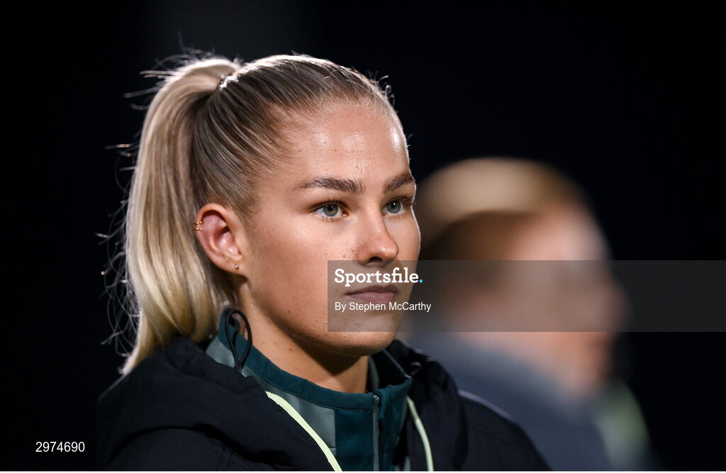29 October 2024; Injured Republic of Ireland player Tara O'Hanlon before the UEFA Women's EURO 2025 Play-Off Round 1 second leg match between Republic of Ireland and Georgia at Tallaght Stadium in Dublin. Photo by Stephen McCarthy/Sportsfile