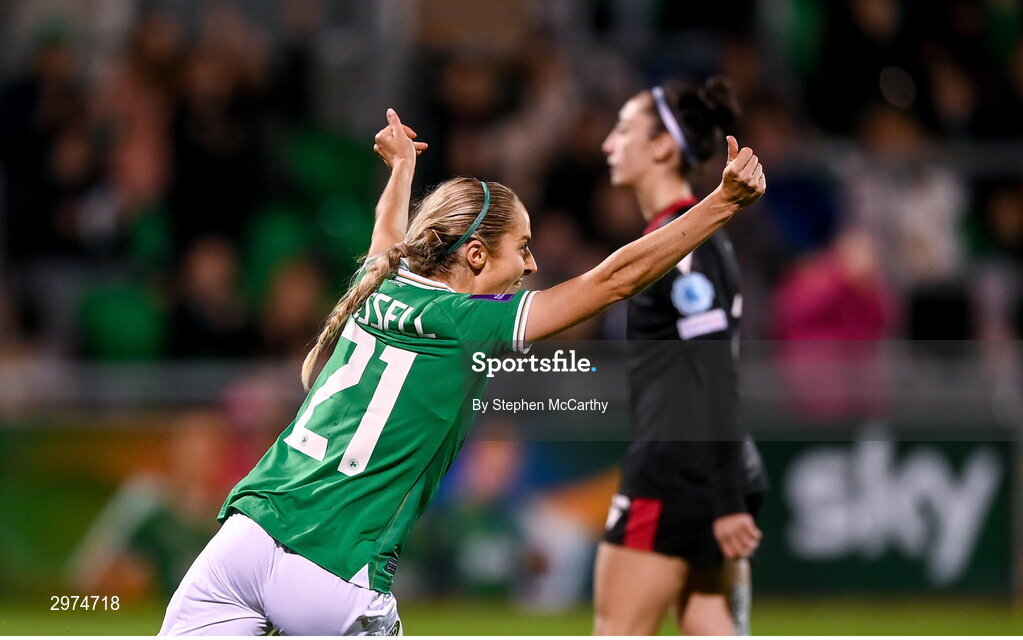 29 October 2024; Julie-Ann Russell of Republic of Ireland celebrates after scoring her side's first goal during the UEFA Women's EURO 2025 Play-Off Round 1 second leg match between Republic of Ireland and Georgia at Tallaght Stadium in Dublin. Photo by Stephen McCarthy/Sportsfile