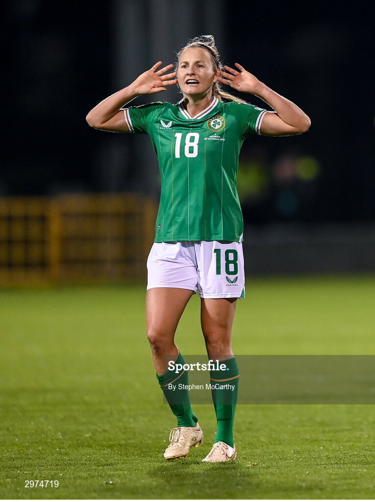 29 October 2024; Kyra Carusa of Republic of Ireland celebrates after scoring her side's second goal during the UEFA Women's EURO 2025 Play-Off Round 1 second leg match between Republic of Ireland and Georgia at Tallaght Stadium in Dublin. Photo by Stephen McCarthy/Sportsfile