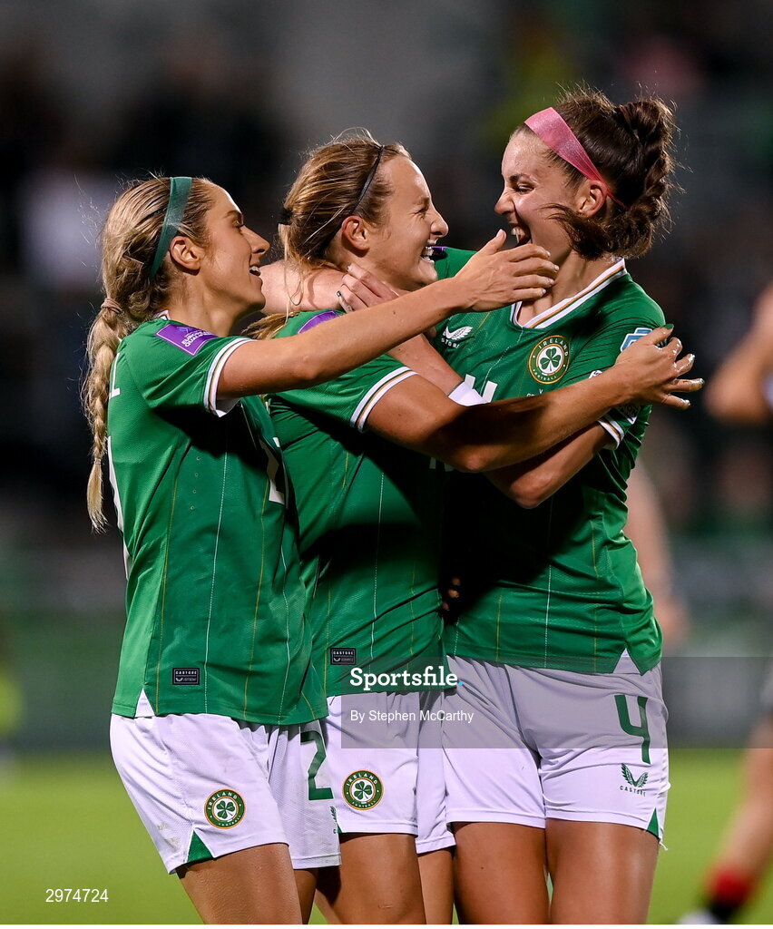 29 October 2024; Kyra Carusa of Republic of Ireland, 18 celebrates with team-mate Julie-Ann Russell, left, and Caitlin Hayes, right, after scoring their side's second goal during the UEFA Women's EURO 2025 Play-Off Round 1 second leg match between Republic of Ireland and Georgia at Tallaght Stadium in Dublin. Photo by Stephen McCarthy/Sportsfile