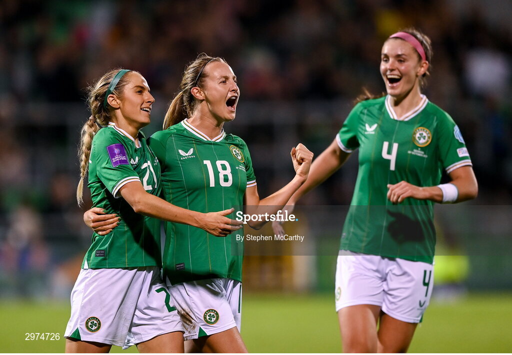 29 October 2024; Kyra Carusa of Republic of Ireland, 18 celebrates with team-mate Julie-Ann Russell, left, and Caitlin Hayes, right, after scoring their side's second goal during the UEFA Women's EURO 2025 Play-Off Round 1 second leg match between Republic of Ireland and Georgia at Tallaght Stadium in Dublin. Photo by Stephen McCarthy/Sportsfile