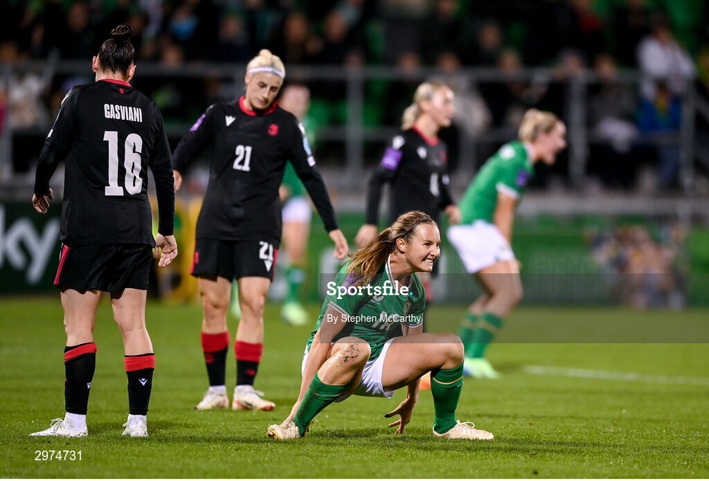 29 October 2024; Kyra Carusa of Republic of Ireland celebrates after scoring her side's second goal during the UEFA Women's EURO 2025 Play-Off Round 1 second leg match between Republic of Ireland and Georgia at Tallaght Stadium in Dublin. Photo by Stephen McCarthy/Sportsfile