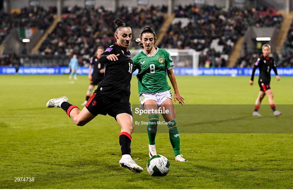 29 October 2024; Salome Gasviani of Georgia in action against Marissa Sheva of Republic of Ireland during the UEFA Women's EURO 2025 Play-Off Round 1 second leg match between Republic of Ireland and Georgia at Tallaght Stadium in Dublin. Photo by Stephen McCarthy/Sportsfile