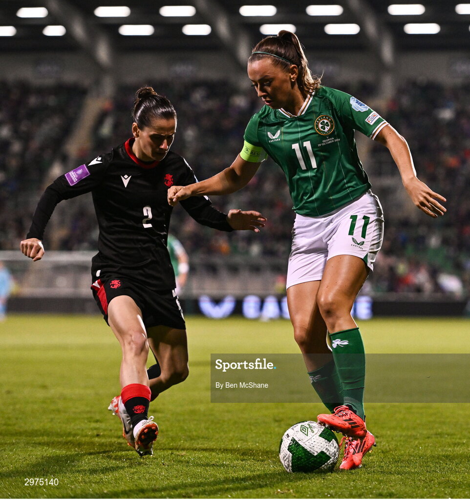 29 October 2024; Katie McCabe of Republic of Ireland and Gvantsa Kadagishvili of Georgia during the UEFA Women's EURO 2025 Play-Off Round 1 second leg match between Republic of Ireland and Georgia at Tallaght Stadium in Dublin. Photo by Ben McShane/Sportsfile