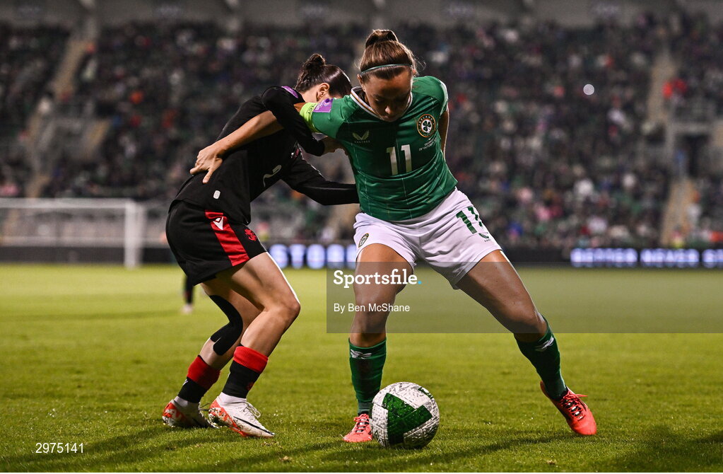 29 October 2024; Katie McCabe of Republic of Ireland and Gvantsa Kadagishvili of Georgia during the UEFA Women's EURO 2025 Play-Off Round 1 second leg match between Republic of Ireland and Georgia at Tallaght Stadium in Dublin. Photo by Ben McShane/Sportsfile