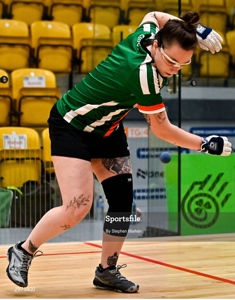 31 October 2024; Eilise McCrory of Breacach, Tyrone, in action in the Open Ladies quarter final during day six of the O'Neills.com World 4-Wall Championships at Croke Park in Dublin. Photo by Stephen Marken/Sportsfile